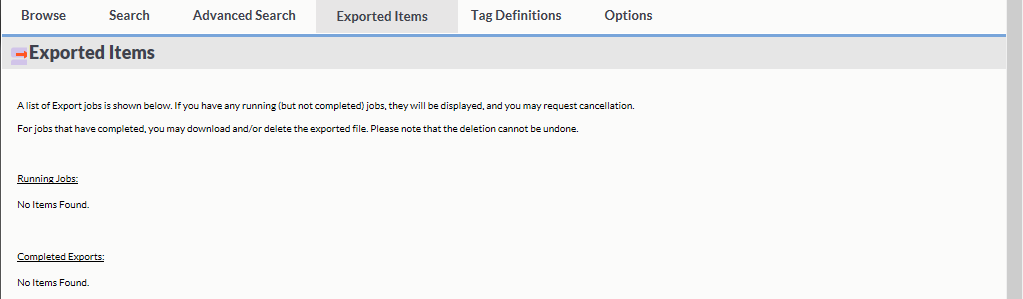 The Exported Items tab shows the export jobs which are currently running, or have been run in the past, on the system. If an export job has completed, this tab will contain the file and provides a link for download of the completed export job.