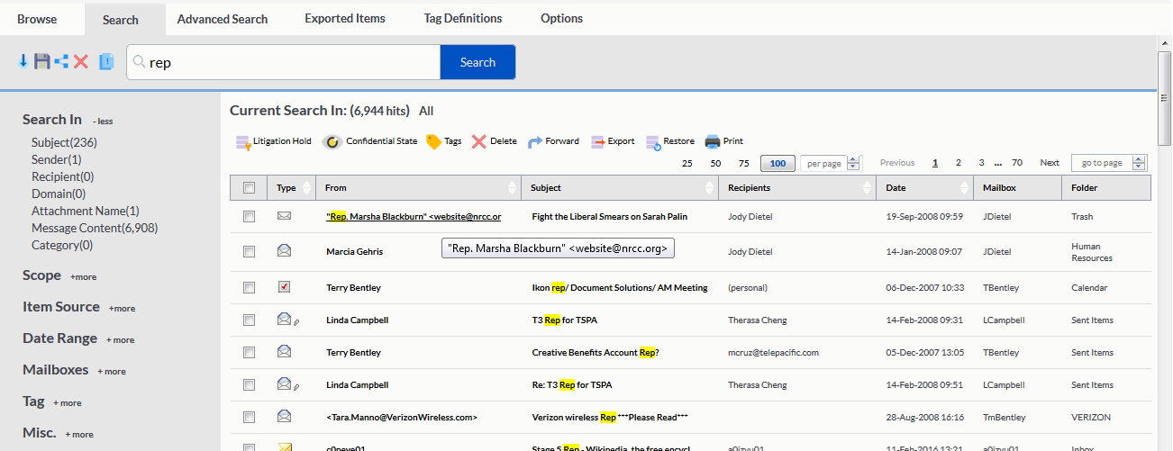 Once search results have begun to populate, the left hand scope pane is populated with limiting and filtering options. If faceting is enabled, the side bar will show numbers next to each section, indicating how many hits there are for each particular topic. The hits are total numbers of matching instances, not items. So if a message states a search term several times in the message body, it will be counted as that many hits even though it is only one message.