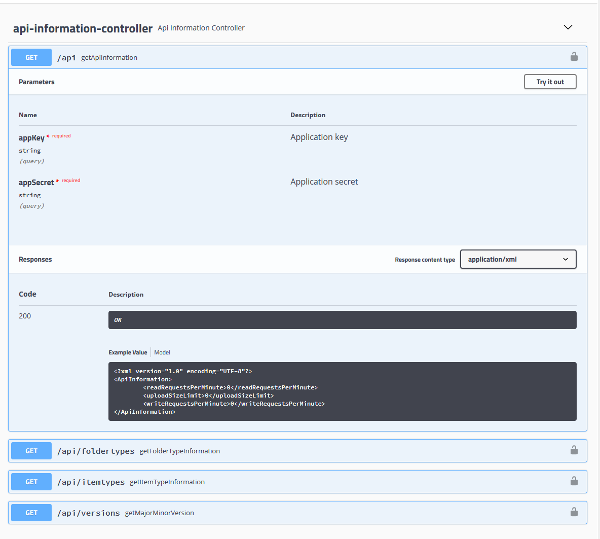 To use an API call press the “Try it out” button.