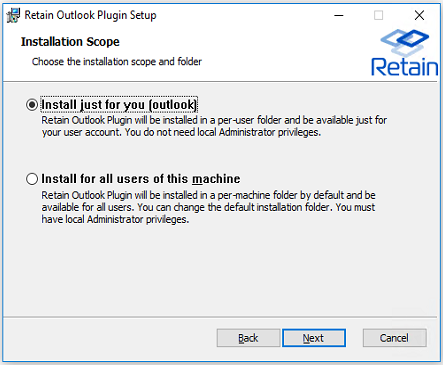 Please Select the Outlook Plugin to Install: There are two options for the plugin. Retain Download allows the user to download data from the Retain server to their workstation. Retain Archive opens the Retain interface in the Outlook window