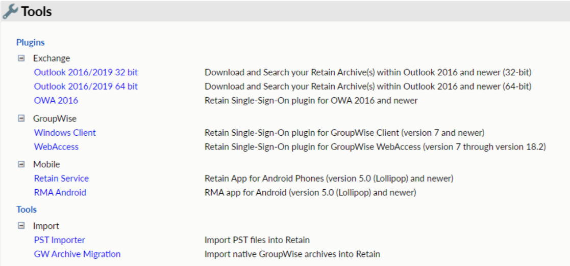 To access the tools page, select the 'tools' link from the top right of the Retain Server administration page.