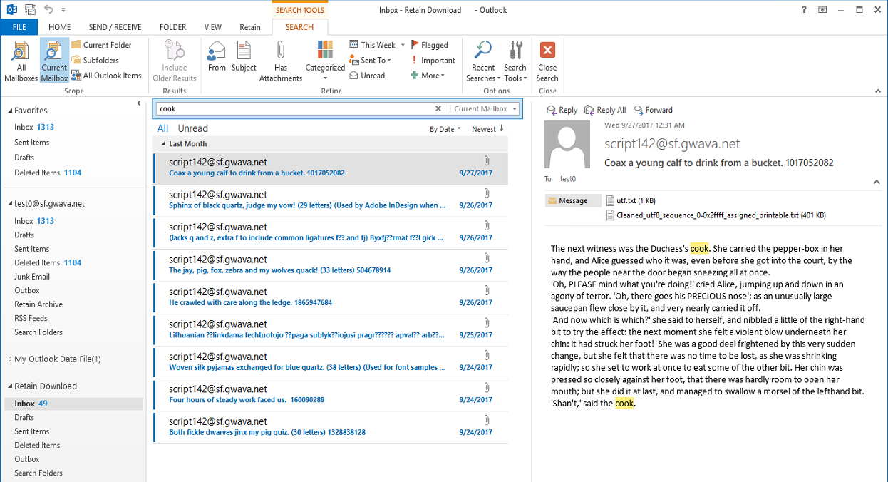 If you have used Retain Download and had your archived messages downloaded into Outlook. You can then use Outlook’s search to further refine your search. For example, if you remembered you received a spreadsheet at the end of last quarter, you could download items from the archive from that time period and then use Outlook’s built-in search capability to find the word “cook” because you remember that was part of the message.