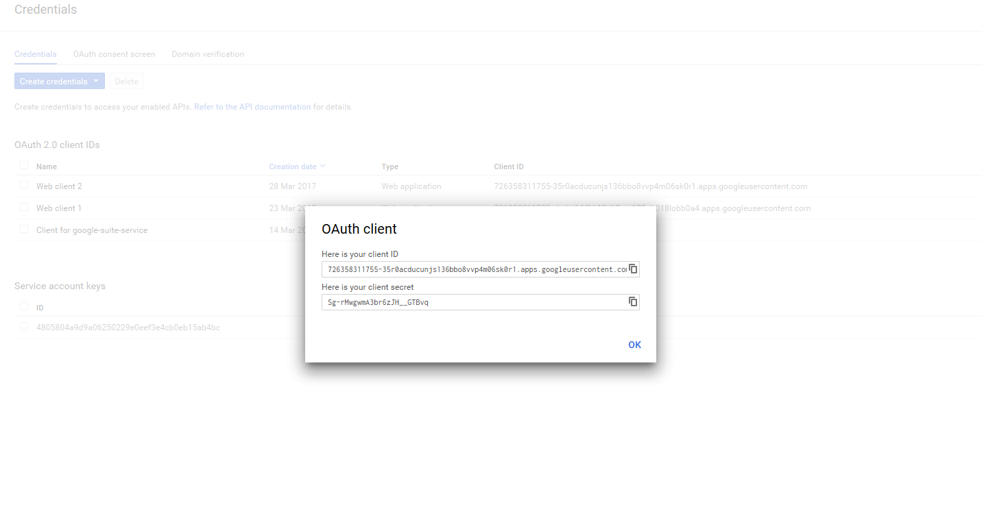 The OAuth client dialog box should be displayed. This dialog box contains the Client ID and Client secret.