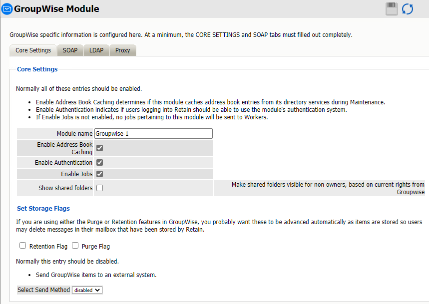 Path: Retain Server Manager > Configuration > Module Configuration > GroupWise-Configure > Core Settings