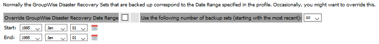 Retain instructs GroupWise Disaster Recovery to load the corresponding backup set for each date range in the profile. If a different set needs to be specified, the override setting specifies a date range specifically for GroupWise Disaster Recovery, which then will ignore the date range in the profile. Retain will still archive according to the profile date range or settings.