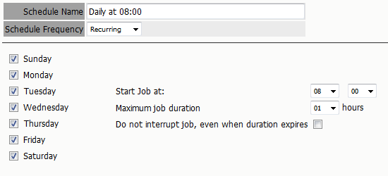 Maximum Job Duration: Specify the maximum time the job can run. If a job runs longer than this limit, it is interrupted by default.