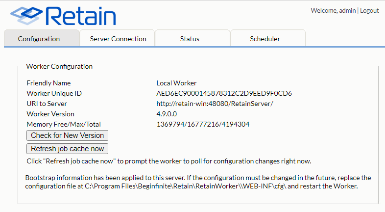 You should be able to see your configuration on the screen, as shown. The Check for New Version button checks for updates. The Refresh job cache now button tells the worker to poll the server for configuration changes and new jobs. After this button is selected, the Worker page will refresh automatically after the Retain Server has been polled. It takes just a few seconds.
