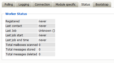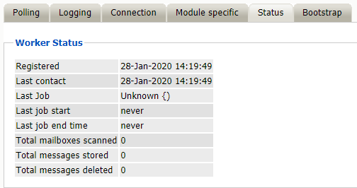 Check this page after the worker has connected to the Server for information and jobs, such as total mailboxes scanned, messages stored, and so on.