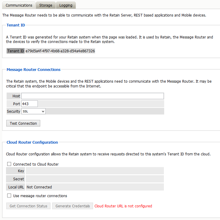 If using the Micro Focus Retain Cloud Router, enable “Connected to Cloud Router” and then the “Generate Credentials” button. These credentials will have to be given to your Micro Focus Salesperson to connect your system to the cloud router system.