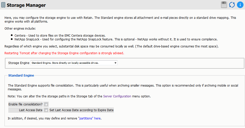 The standard storage engine is the standard storage option which should be selected for all new installations of Retain. The storage engine utilizes locally accessible drives and media. When selecting this option, make sure that storage requirements will be easily met, size or capacity increased, and managed.