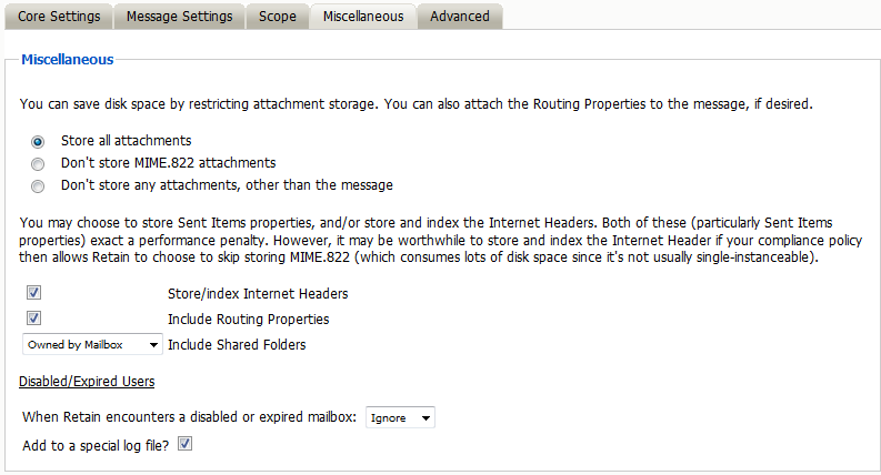 This option tells Retain to store the headers in the SQL database. In order to use the header search option in the search interface you must have this option selected. To save disk space and still satisfy storage compliance, select this option and select “Don’t store the mime.822 attachments”. All other parts of the MIME file are already being archived, so if you store and index the Internet Header, you will already be archiving all information required.