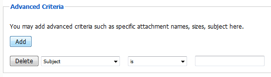 The advanced tab allows the administrator to be even more specific in what to archive and what to exclude. The criteria added under the ‘advanced’ tab will limit associated jobs to only the items matching the criteria. Up to 6 lines of advanced criteria may be added to each profile. Each additional line will be logically AND-ed together. For example, the system will archive all items where the following is true: Criteria A AND Criteria B AND Criteria C AND etc.