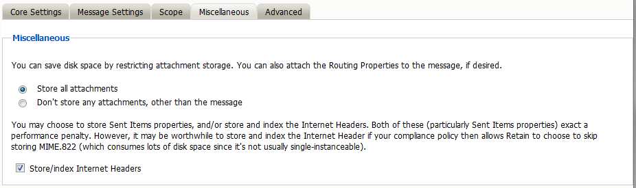 The miscellaneous tab allows the configuration to allow or deny archiving and indexing of attachments in Retain. If attachments are to be archived, they may also be indexed to provide searching capability in the browse messages interface.