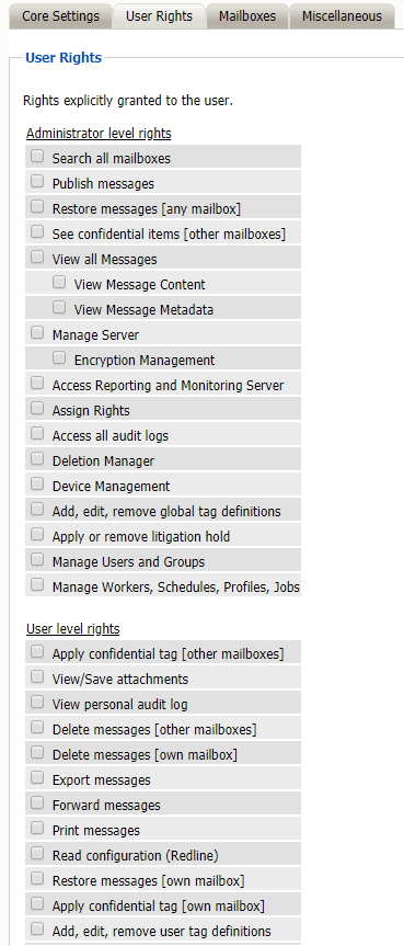 All user level rights are strictly optional, and add functionality. None are needed to access your own mailbox and other mailboxes assigned to you. The "Default" group grants Forwarding, View Attachment, and Printing rights. Note: There is no way to perfectly block printing in a web browser, so using this feature should not be taken as a 100% guarantee that users won’t be able to print. Nonetheless, for most users, it is effective. Rights marked [other mailbox] refers to other mailboxes the user has been granted rights to as explained below for the Mailboxes tab.
