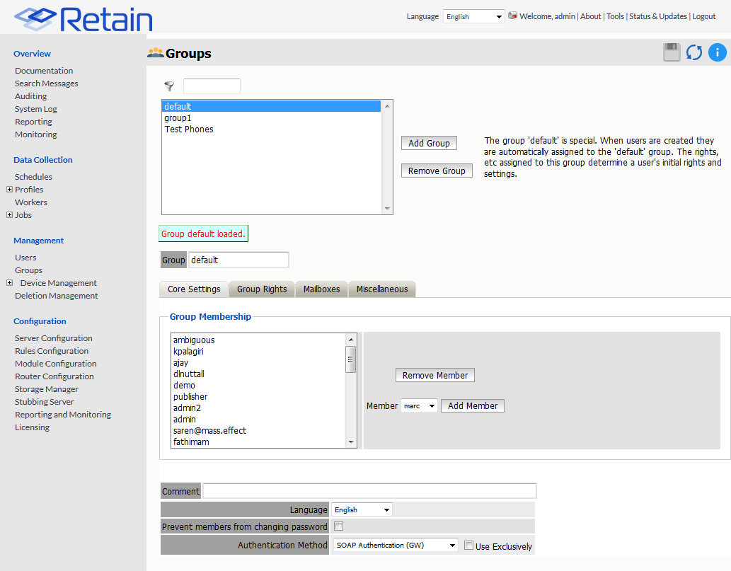 In the Groups screen, you will see all defined groups. The group default is created when you install Retain. Users are automatically assigned to this group. If you want users to be part of another group, you must first create that group and then add users to it.