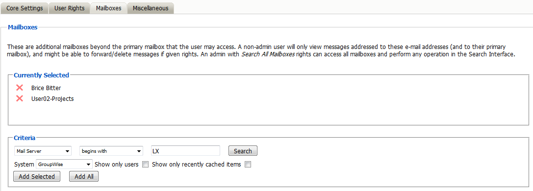 Input the Retain Server’s DNS or IP Address and the login for the account with message export rights and rights to the desired mailboxes. Unless the login account has the administrator level right to ‘search all mailboxes’, only the mailboxes granted to the auditor account will be accessible. Granting rights to mailboxes other than the active user’s own mailbox are specified in the user rights section, under the ‘mailboxes’ tab.