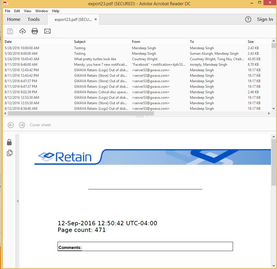 The finished PDF contains all the information displayed in the viewer, as well as an option to save individual text or message sources. (This information includes redactions, litigation tags, confidential tags, strikeouts etc. from the Retain Server archive as well as the Viewer.)