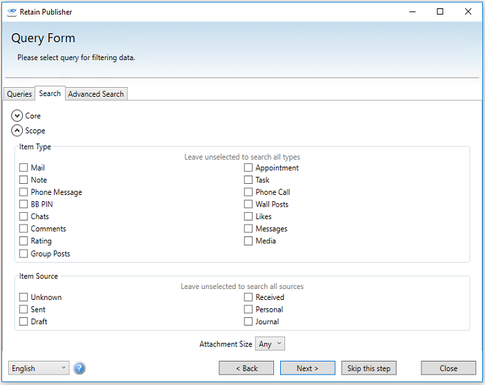 Select or create a query to filter the scope of the export job. There are three tabs but you only need to use the one you need to build the query. You can use a query saved in the Retain Web console, a simple search or an advanced search.