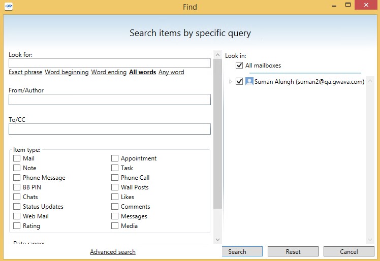 In addition to the operators and text, the sending Author or the destination and carbon copy recipients of a message as well as item type and the date range can specify or restrict a search. Selection of the date range is done through an interactive calendar.