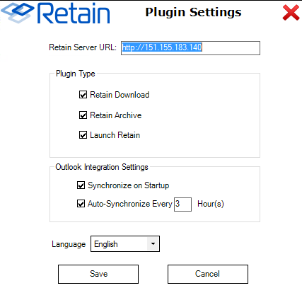 Plugin settings is where you set the URL to the Retain Server and other settings like Language. Generally, only your system Administrator will need to change these settings.