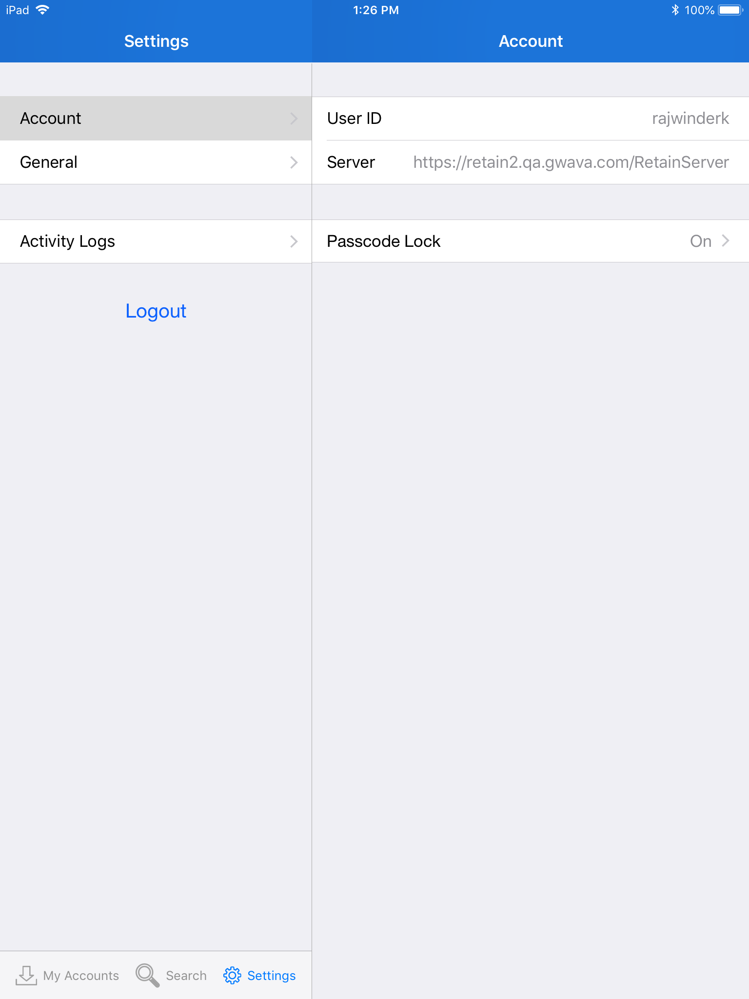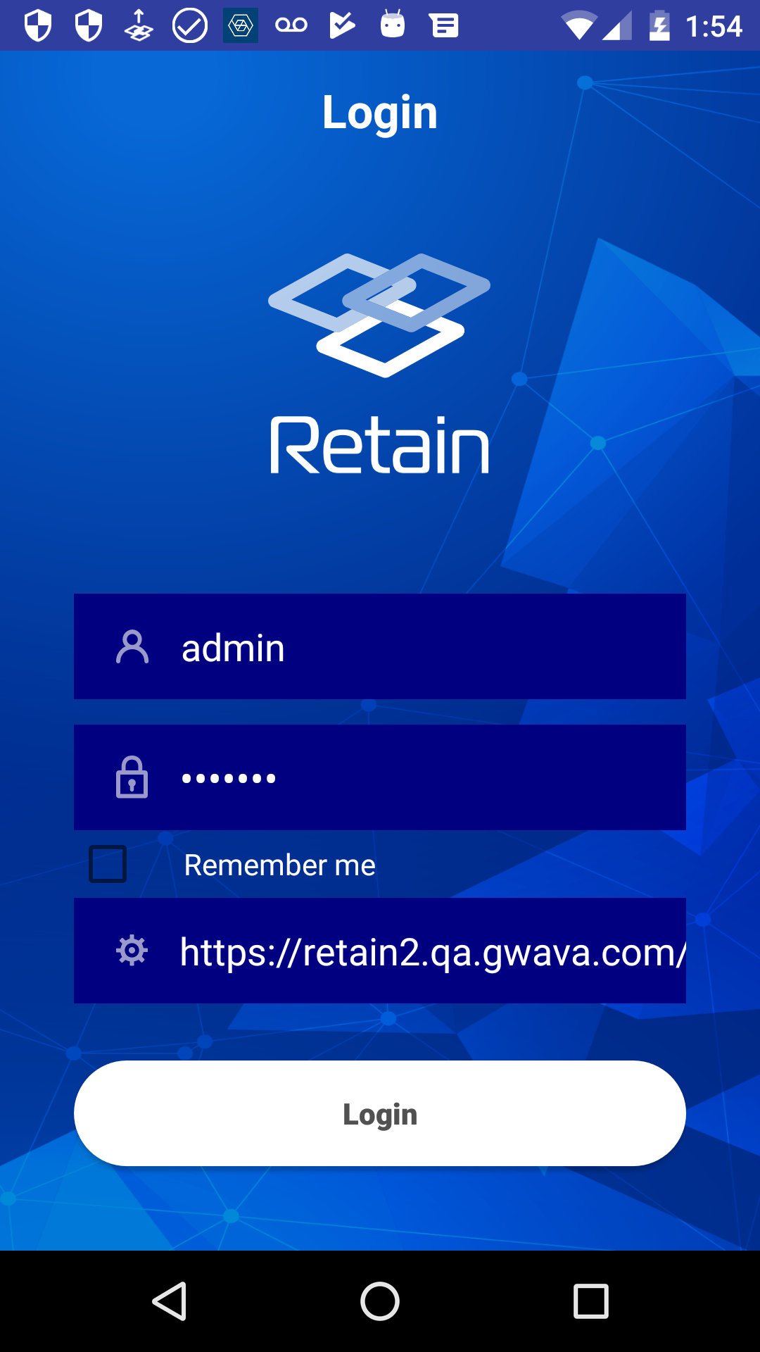 Once the app is downloaded and installed, enter the Retain Server address. This should be given to you by the system administrator and is in the form of “https://<Retain-Server-URL>/RetainServer”. Log in with your email credentials