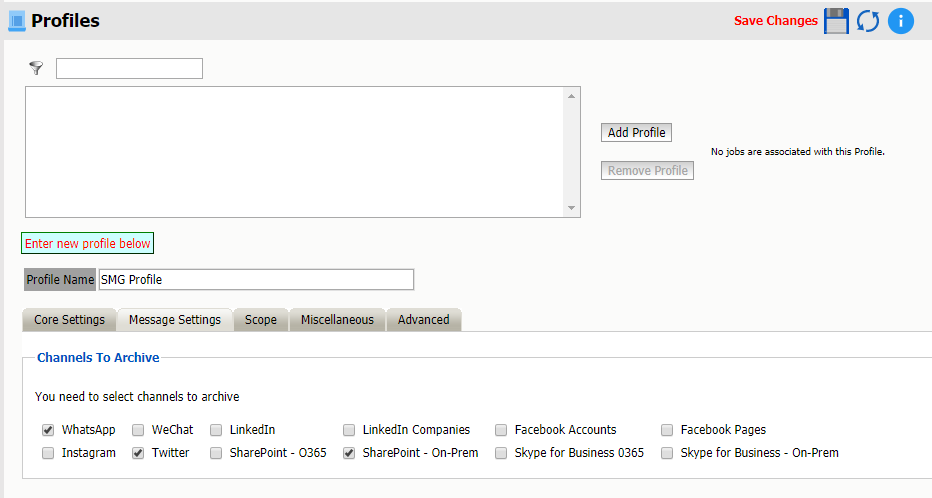 The Social Media Governance Profile allows the administrator to dictate what types of message data is collected and from which Social Messaging channels.