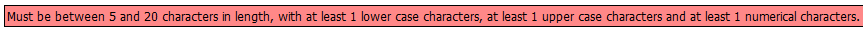 Medium: Must be between 5 and 20 characters in length, with at least 1 lower case characters, at least 1 upper case characters and at least 1 numerical characters.