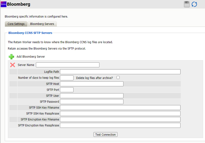 To begin configuring the Bloomberg Module, open Retain Server Manager > Configuration > Module Configuration > Bloomberg-Configure > Core Settings.