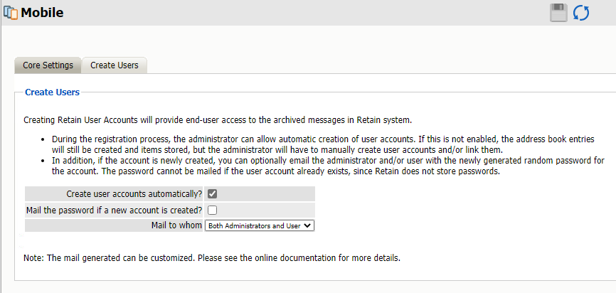 Path: Retain Server Manager > Configuration > Module Configuration > Mobile-Configure > Create Users