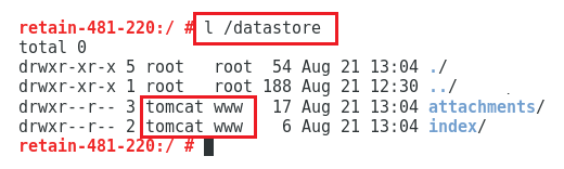 chown –R tomcat:www /datastore/attachments chown -R tomcat:www /datastore/index chmod –R 744 /datastore/attachments chmod -R 744 /datastore/index