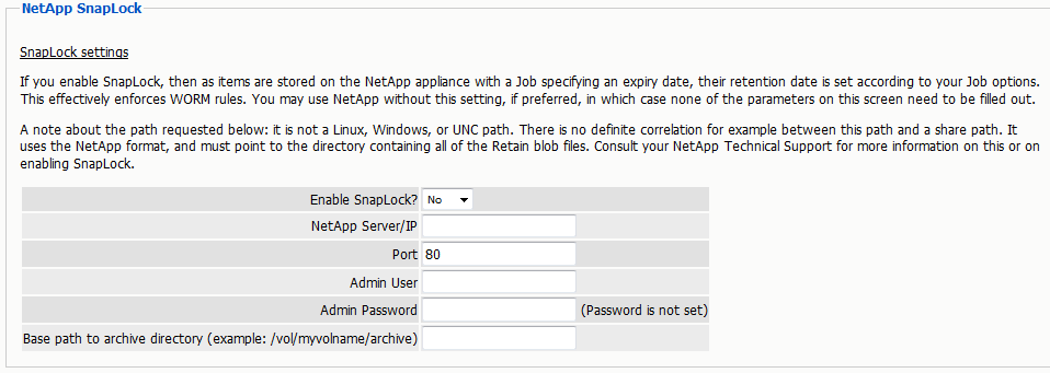 NetApp is fully supported with SnapLock for storage. Note the information in the option. To enforce WORM rules you MUST set the Job Expiration feature. Also set the IP address, user name, password, and the correct path to the server. The path must be set in netapp format.