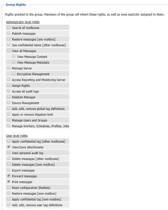 To log into and manage or monitor Workers, a User or Group must have the manage workers, Schedules, Profiles, Jobs right. To set or work with the Deletion Manager, the user must likewise have the Deletion Manager right, or they will not be able to modify those settings. There are, however, certain rights which implicitly grant other rights. For example, granting a Group the Restore Messages [Any Mailbox] right automatically grants the Restore Messages [Own Mailbox] right.