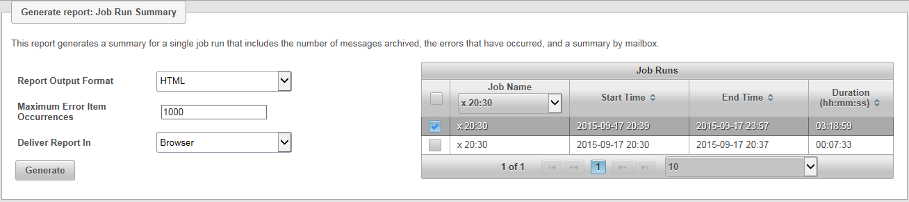 The Job Run Summary report gives a complete report of the performance of a single job. Whereas the Job Run Averages report charts raw performance averages, the Job Run Summary report goes into greater detail on the total number of archived messages, the errors, and mailbox summary for a single instance of a job.