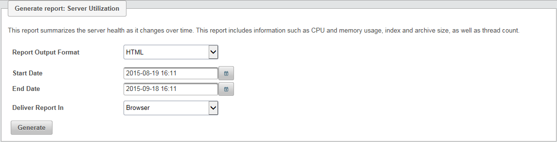 The Server Utilization report is a direct report on the load that the Retain Server is under. The only option is to limit the date range for which the report is active. Select the report period and then select ‘Generate’ to produce the report.