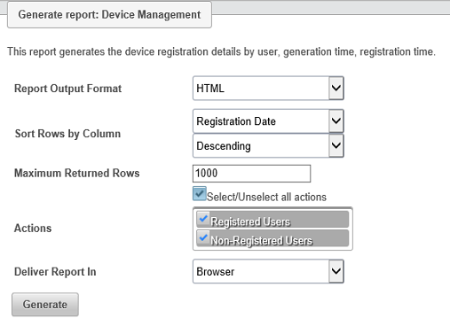 The device management report generates the device registration details by user, generation time, registration time.