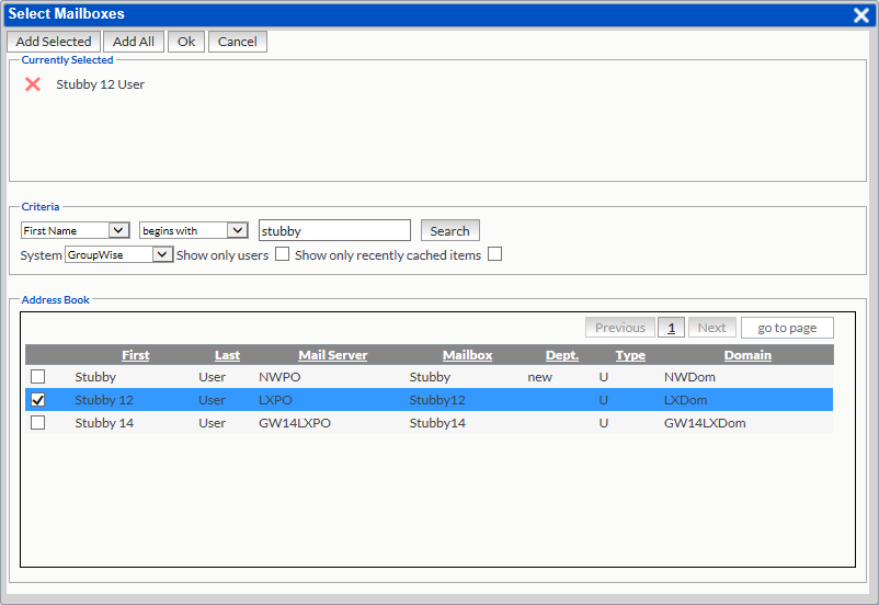 The Select Mailboxes window allows for searching of every mailbox available to the user, the admin user can search all mailboxes. Mailboxes must be searched for by system and specified criteria. The results of the search are displayed below, while the active selected mailboxes can be added to the dialog through the use of the ‘Add Selected’ button along the top. Alternately, if the ‘Add All’ button is clicked, it will add all mailboxes displayed in the search results, the Address Book field. Addresses which have been added to the top field may be removed by selecting the red ‘X’.