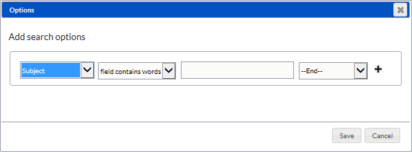 In addition, the interface allows for no limit of search terms, additional terms can be added to the search criteria and connected to the previous search terms. Additional criteria may be logically connected with ‘and’, ‘or’, or ‘new group’. To add a new search term and criteria, select the ‘+’ directly to the right of the existing search criteria.