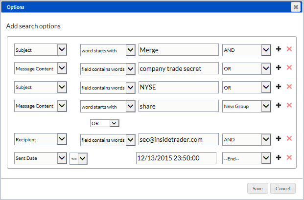 When building complex search criteria, it is critical to know what you are looking for. For instance, if an insider trading tip was suspected, and the recipient was known as well as some details about the message and when it must have been sent by, the following search could be compiled: