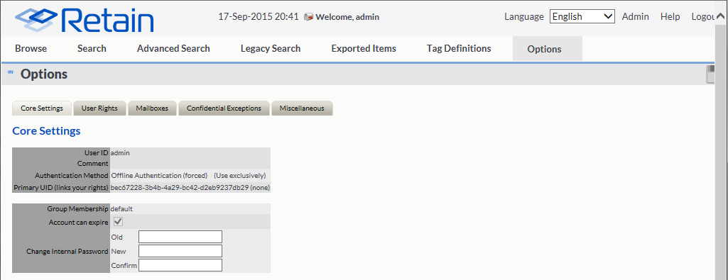 The options section here is exactly like the section in the Administration | Users section. These settings here are specific to the currently logged in user. The current loaded user is shown next to “User ID” located below the Core Settings tab.