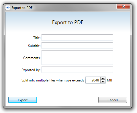 In addition to the standard file name and location, the PDF has title, exported by, and comment sections that the user is prompted to specify before the viewer publishes the PDF.