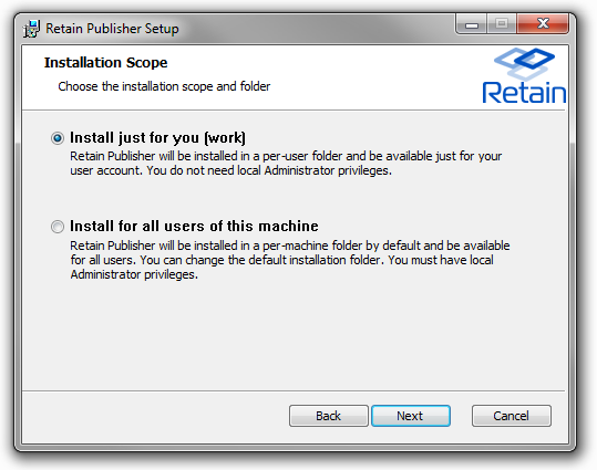 The Retain Publisher installation is very similar to the Viewer installation. Basic questions are asked, and the installer checks for .NET 4.5 SP1 before copying or installing any files. Click ‘Next’ to continue.