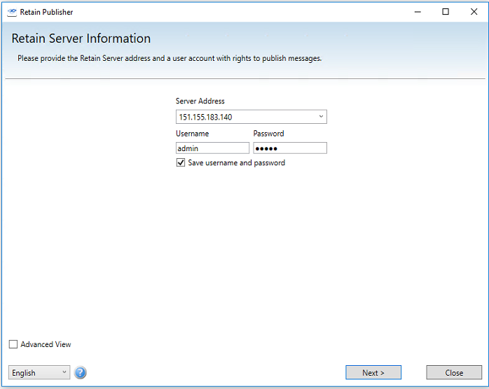 The Publisher must be used in conjunction with a user that has administrator rights to publish messages. Because the Publisher connects over the network, it requires an open network connection to the Retain Server.