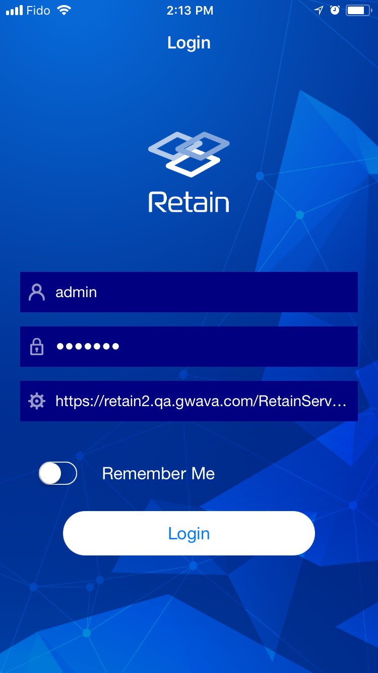 Once the app is downloaded and installed, enter the Retain Server address. This should be given to you by the system administrator and is in the form of https://<Retain-Server-URL>/RetainServer. Log in with your email credentials