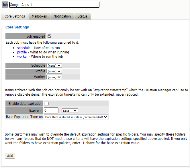 Job Expiration is not retroactive for mail in the database, and only applies to mail archived by the job that it is active for. The base folders and criteria are specified under the custom expiration dates accessed through the ‘Add’ button at the bottom. All messages included in any specified folders will have a different date or be exempted from the standard expiration date. To have messages with custom job or folder expiration dates properly expire, the deletion management date scope must be set to delete messages with an Expiration Date older than 1 day.