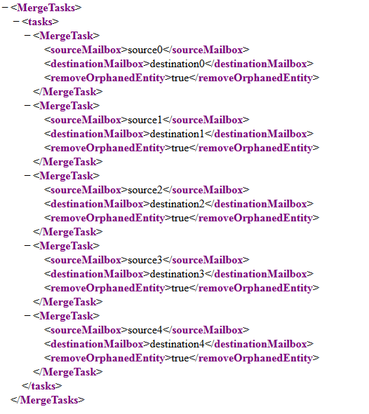 A sample XML file is provided and can be download from the ‘Mailbox Merger/Splitter’ utility page, it is also shown below.