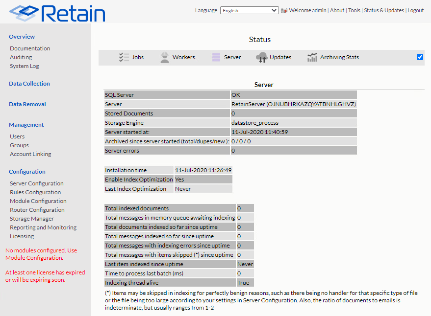 The Server tab shows the basic status of the Server with the messages archived and maintenance information. |