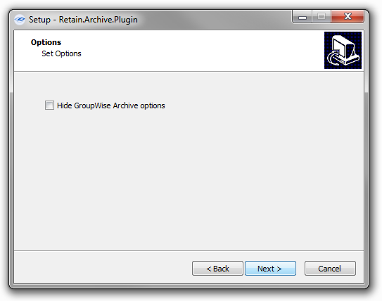 The Retain plugin may be used instead of the GroupWIse Archive. To hide the GroupWise Archive in favor of the Retain Archive, select the box and click 'Next' to continue.