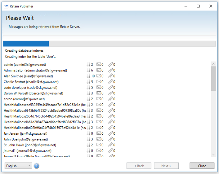 The Publisher will connect to the Retain Server and export the qualifying messages from the selected users mailboxes and builds the local archive.