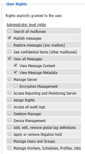 The Administrator account for Retain automatically has the publish messages right, and can be used here, though it is highly recommended to create and use an auditor account with the mail export right and access to the desired mailboxes or post offices required.