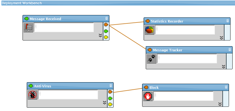 A recommended configuration is a Statistics Recorder and Message Tracker for all messages, and an Anti-Virus blocker.